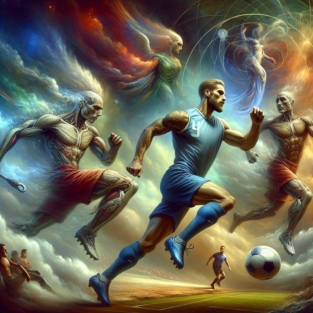 This concept art depicts a skilled athlete dribbling past two formidable opponents in a fantastical setting. The digital painting features rich colors and immersive detail, resembling high-end game graphics.