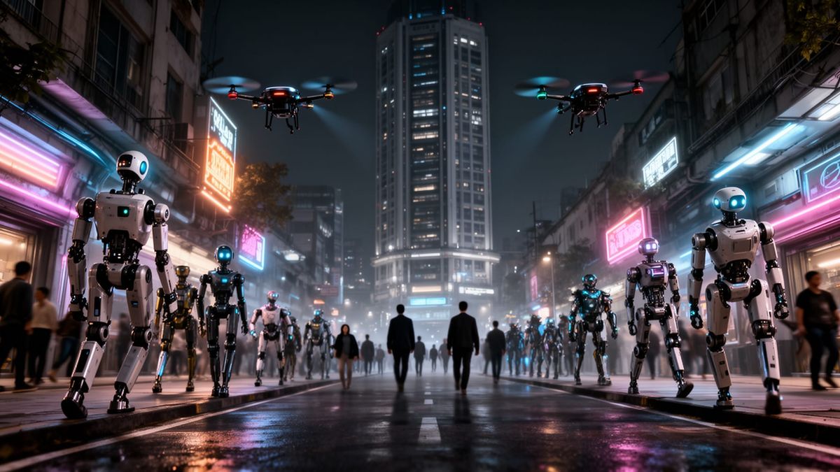 This hyperrealistic image depicts a futuristic city street at night, filled with diverse robots and androids. High contrast and atmospheric lighting highlight intricate details, with flying cars and drones adding to the moody, cinematic scene.