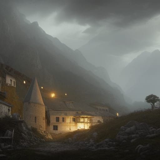 A detailed digital painting of an abandoned asylum in a mountainous, rural landscape. The image features dynamic lighting, deep colors and intricate details, reminiscent of dark fantasy concept art.