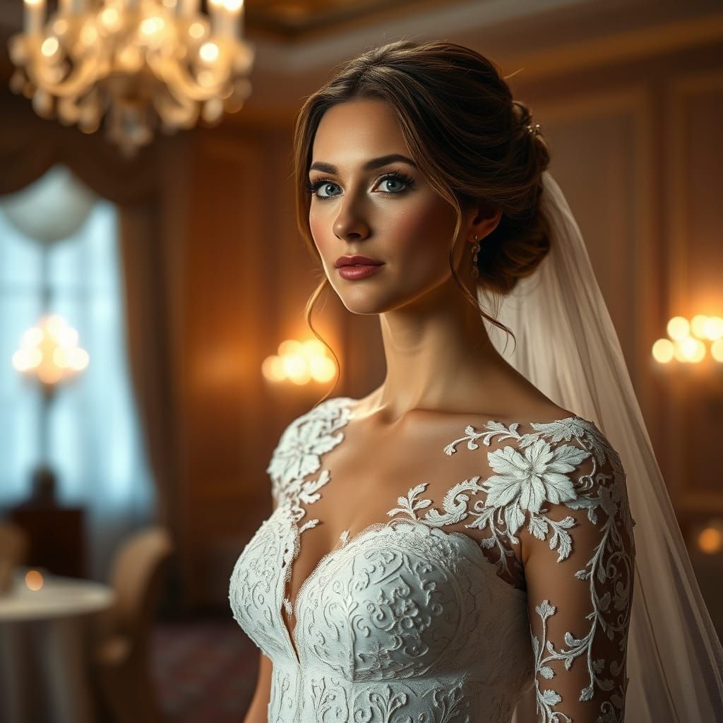 This image showcases a bride in an elegant ballroom, wearing a stunning lace wedding gown with a flowing train. The photorealistic style captures exquisite detail and romantic lighting.