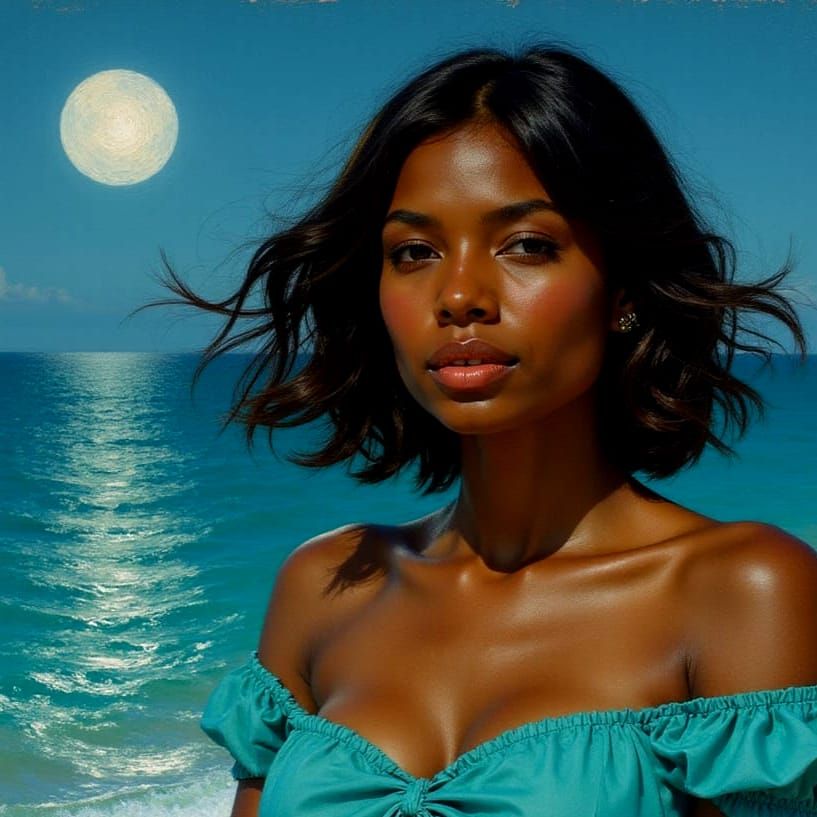 A painterly oil portrait of a dark-skinned woman in a turquoise gown on a tropical beach at night. The artwork captures a serene, moonlit scene with a whimsical impressionist feel.