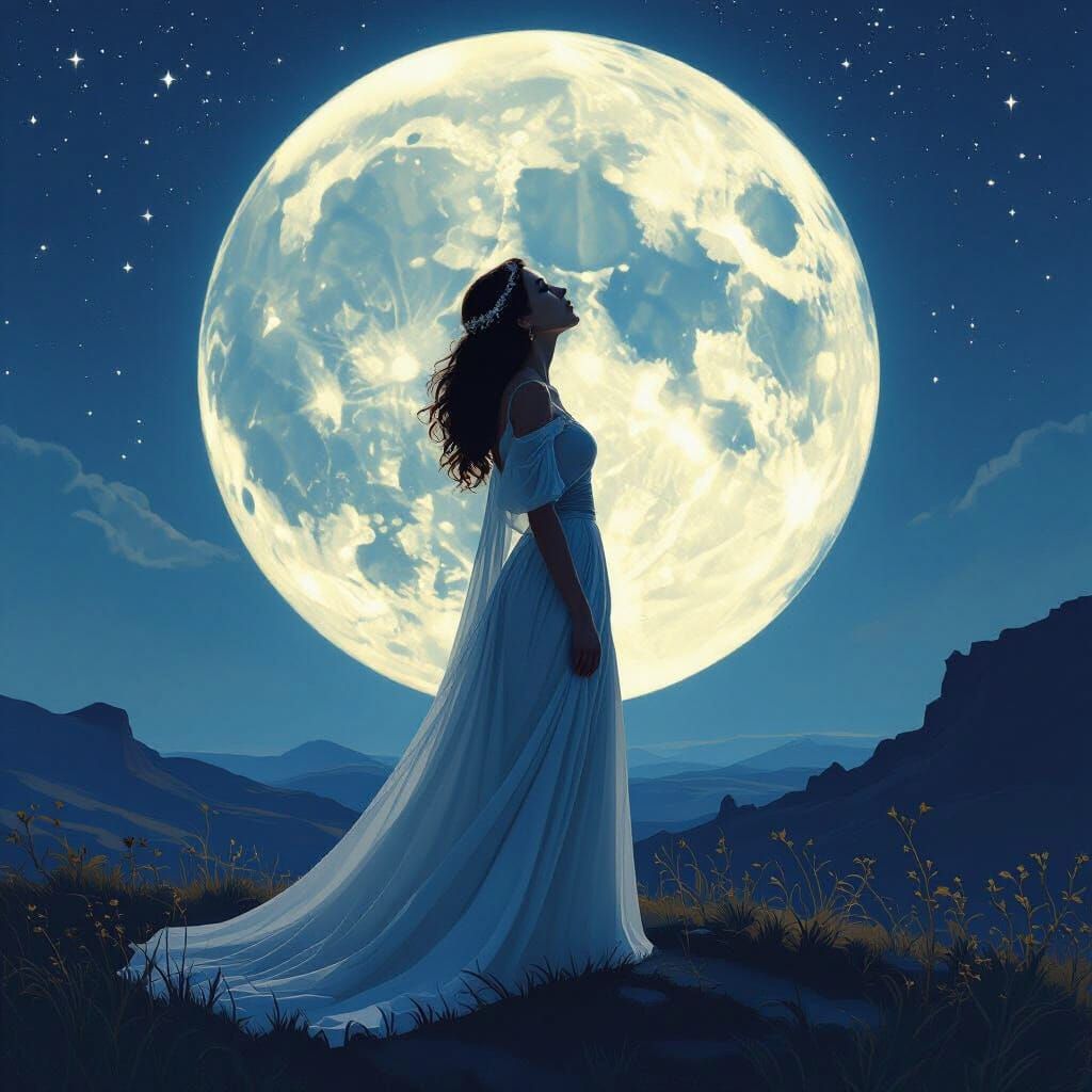 A lone woman stands silhouetted against a gigantic full moon, her face upturned in awe. She is clad in a flowing gown that blends seamlessly with the night sky. The surrounding landscape reaches depths unknown. The scene is rendered in a style reminiscent of cosmic surrealism, with deep colors, intricate ...