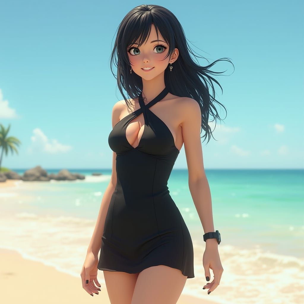 A striking picture of a smiling woman with long black hair on a serene beach. She wears a black halter dress and sandals in a 3D Final Fantasy style.