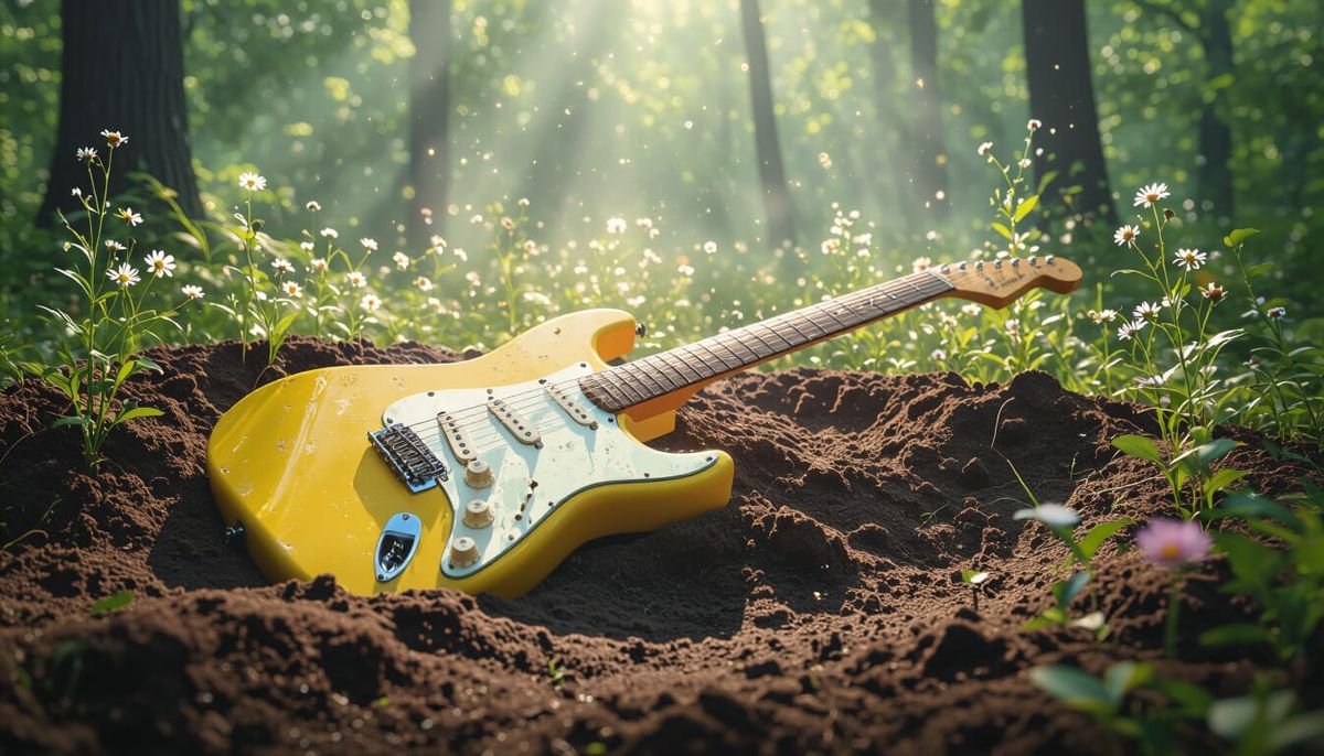 This image shows a yellow Fender Stratocaster guitar half-buried in soft earth in a forgotten forest. Sunlight filters through the trees, illuminating dust motes. Wildflowers bloom around it, with mist near the ground.