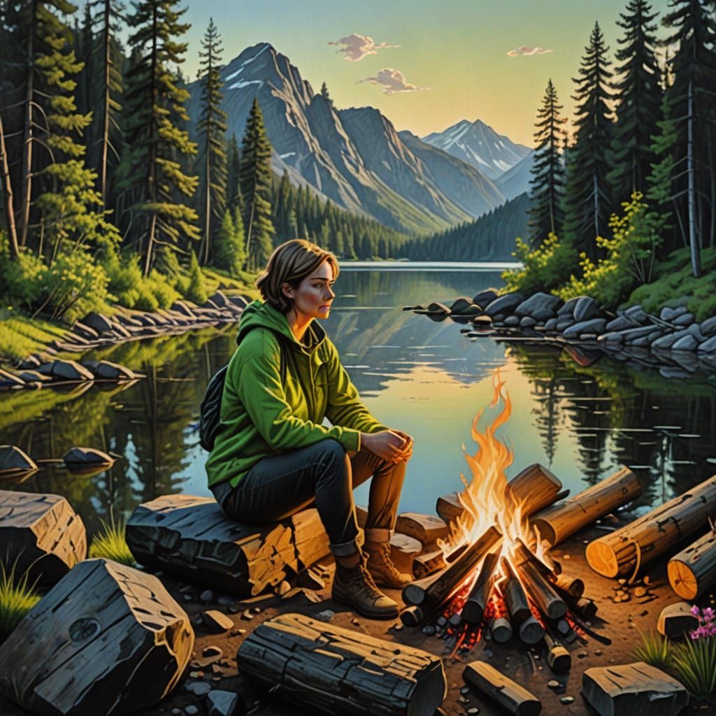 This image shows a lady with short hair wearing summer clothes. She is sitting on a rock by a campfire in a forest next to a lake on a summer day, depicted as a hyperdetailed charcoal drawing.