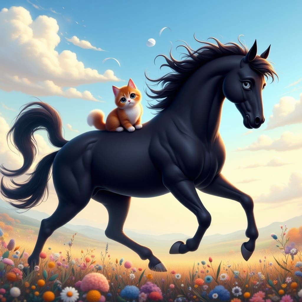 This image captures a regal cat sitting proudly on a galloping black horse, set against a sweeping landscape. Inspired by anime and 3D art, with a focus on vibrant colors and dynamic poses, reminiscent of concept art and fantasy worlds.