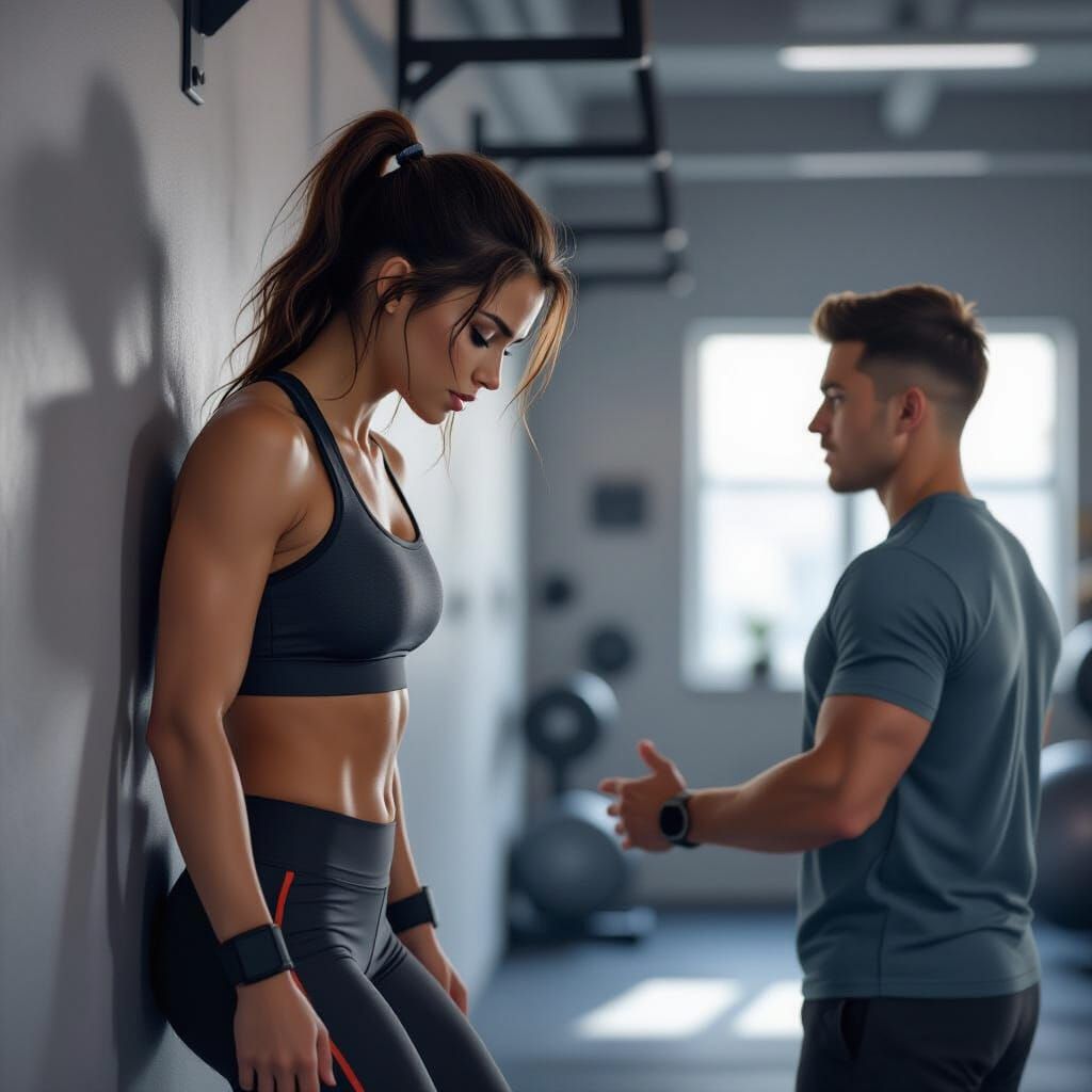 A striking picture of a woman in sportswear starting to climb wall bars in a gym, guided by a male instructor. The image features dramatic lighting and expressive character design as digital artwork.