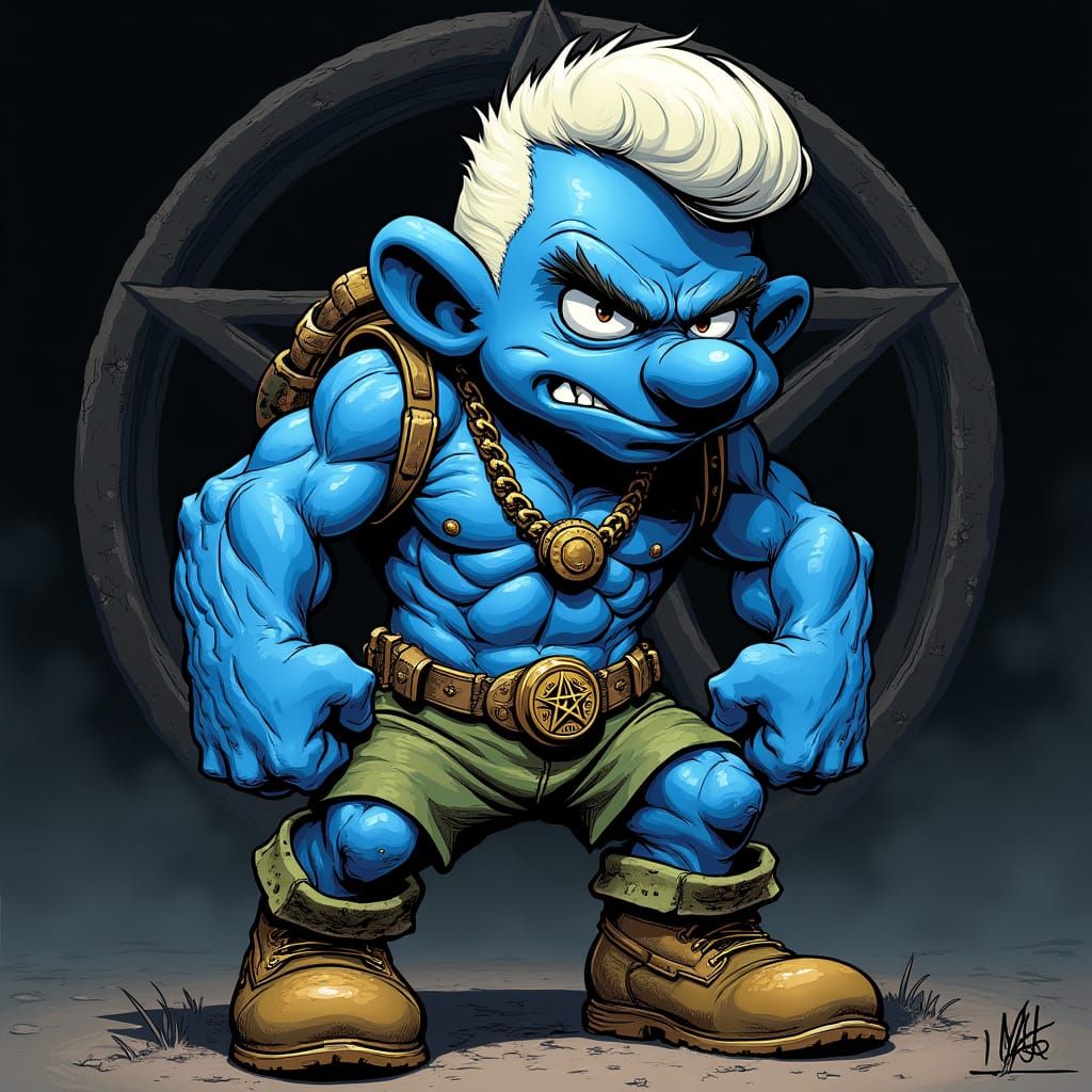 This image shows a menacing Smurf character with a military haircut and muscular build. He is wearing camo clothing and a Thor's hammer necklace, standing before a dark background featuring a pentagram, in a comic book art style.