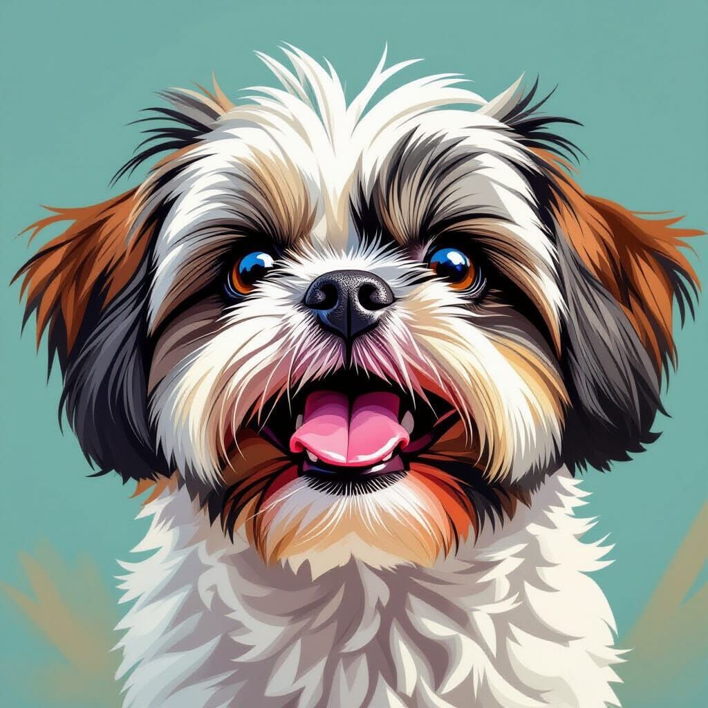 A close-up image of a happy Shih Tzu dog with realistic eyes. The vibrant colors and textures create a hyper-realistic, ultra-detailed comic book aesthetic.