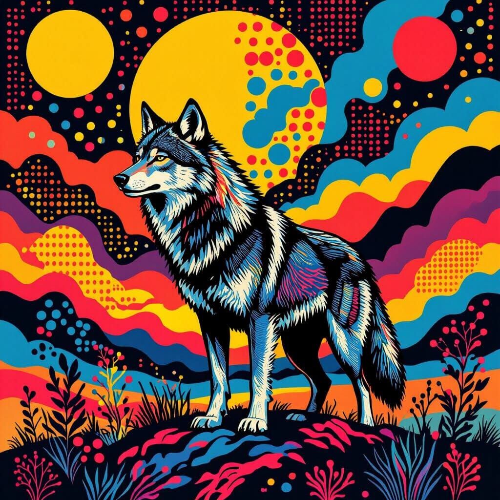 A striking picture of a wolf standing in a colorful pop art landscape. The image features bold colors and dynamic patterns, reminiscent of the pop art movement.