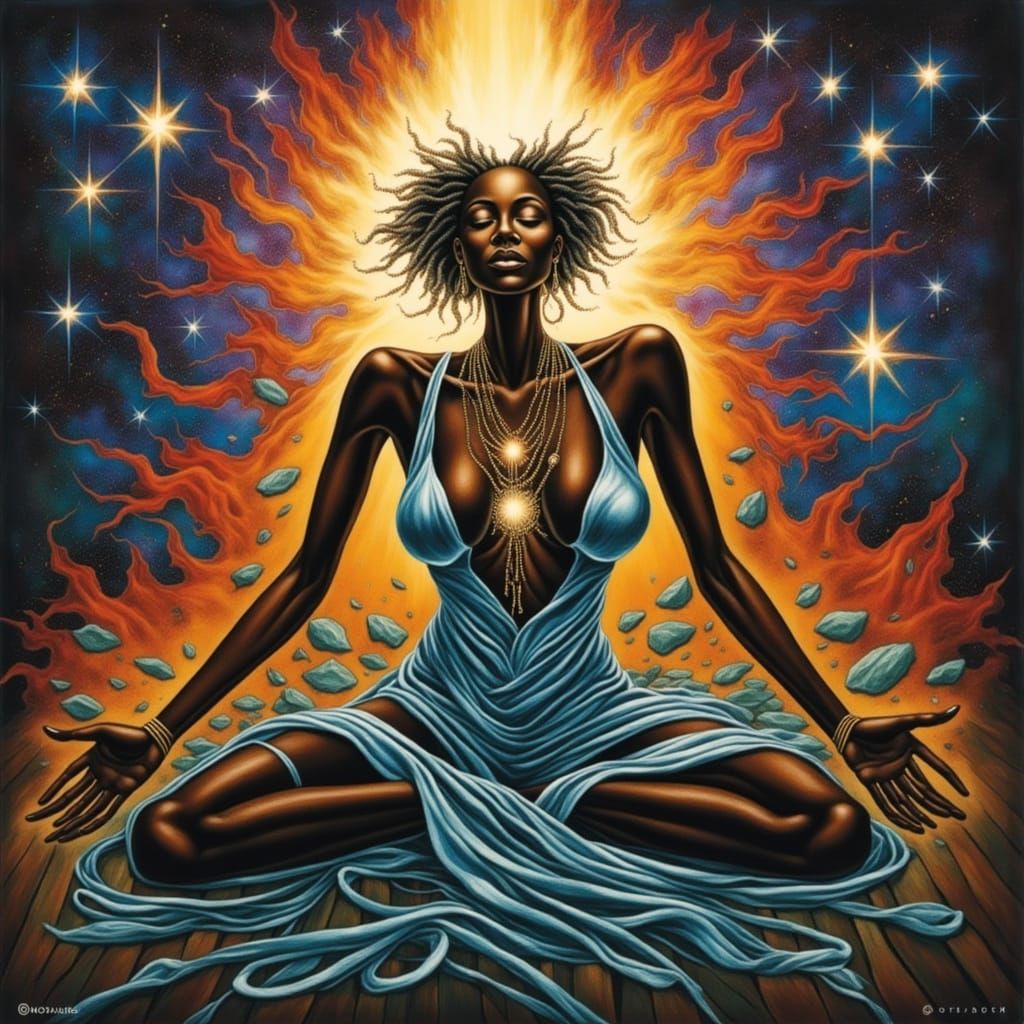 This image depicts a radiant black woman as a spiritual being, her body made of light. It's rendered in a luminous, mystical surrealist style with vibrant colors and otherworldly lighting.