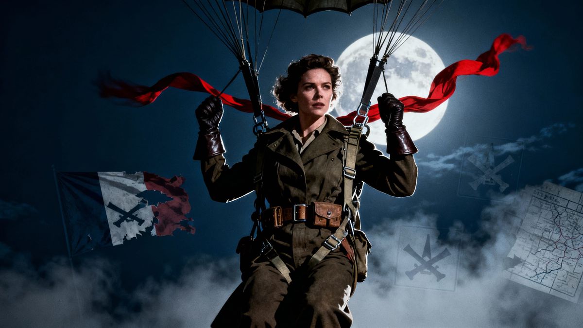 This image depicts a determined woman parachuting into occupied France during WWII, dressed as a spy. Created in a dramatic, cinematic style with strong lighting and atmospheric mist.