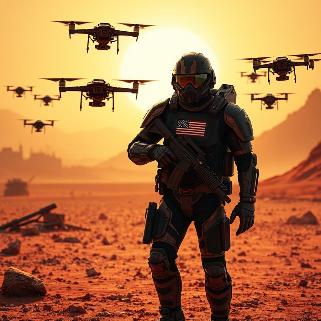 This image depicts a gritty, diesel punk soldier standing heroically on a crimson-hued Martian terrain, surrounded by close-range drones and the skeletal remains of a once-thriving cityscape. Rendered in a cinematic, high-octane aesthetic with a warm, golden light and bold shadows, evoking a sense of ind...