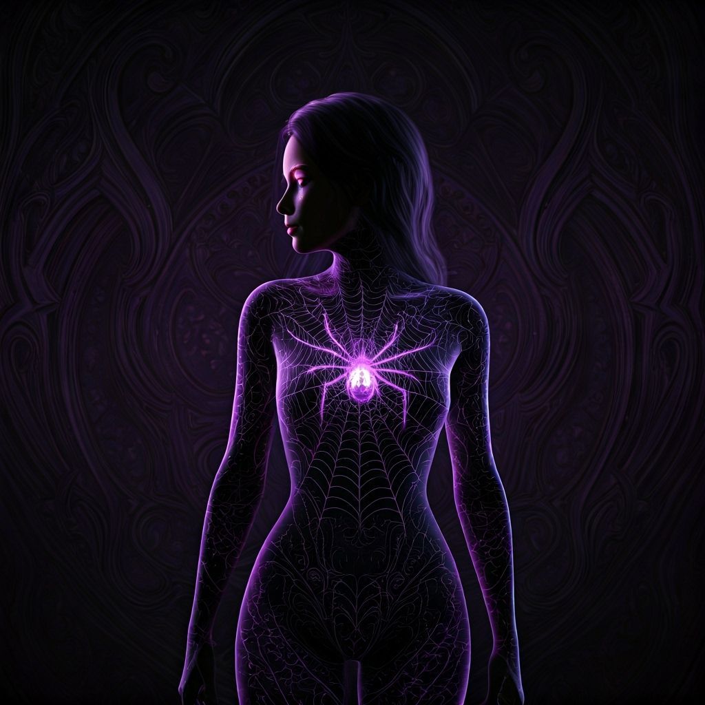 This image shows a gothic woman's silhouette in a spider web bodysuit with glowing rune tattoos. The mystical scene features deep colors and ornate details, evoking a fantasy world with cinematic polish.