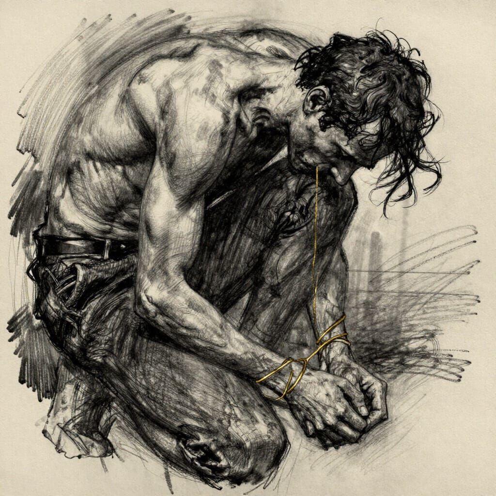 This hyperdetailed charcoal and ink drawing features a hunched figure in aggressive strokes and smudged shadows. A thin gold thread weaves through the darkness, creating stark contrast and a visceral composition.