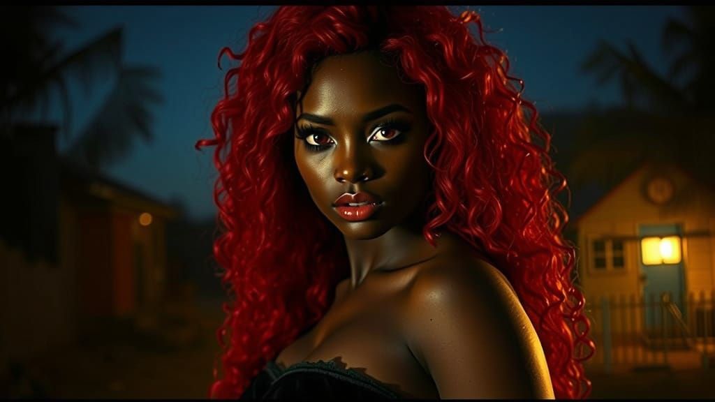 A captivating image of an African witch with striking red hair and eyes against a dark night. The scene is lit with cinematic lighting and has a film-like aesthetic.