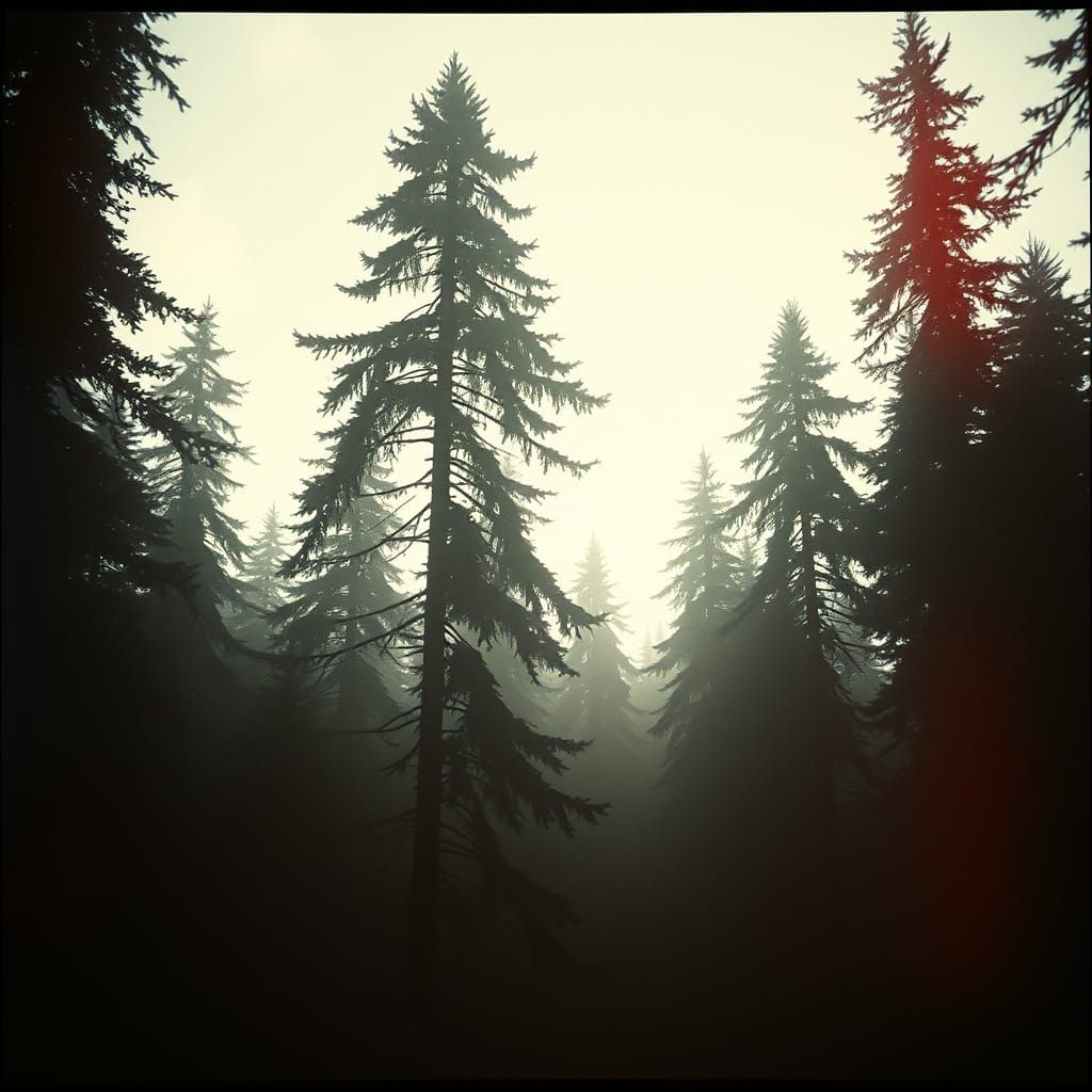 This image showcases a tranquil forest in black and white. The grainy film style, soft tones, and warm light leaks evoke a sense of nostalgia and timelessness. A detailed matte painting with deep color.
