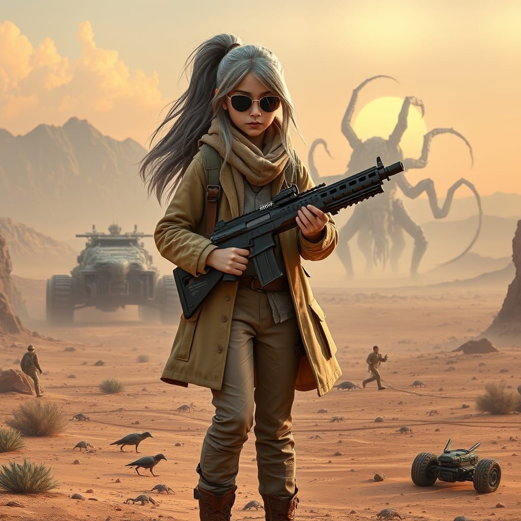 This image shows a young female warrior standing in a post-apocalyptic landscape, surrounded by ruins and a massive armored vehicle. She wears a sand-colored coat and holds a sci-fi shotgun, with a tentacled monster looming in the distance. The scene is rendered in a photorealistic desertpunk style, with...