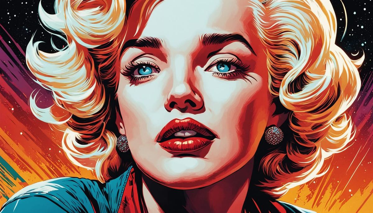 This image shows a close-up of Marilyn Monroe in retro comic book art style. The vibrant colors, bold lines and high contrast capture her iconic and captivating gaze.