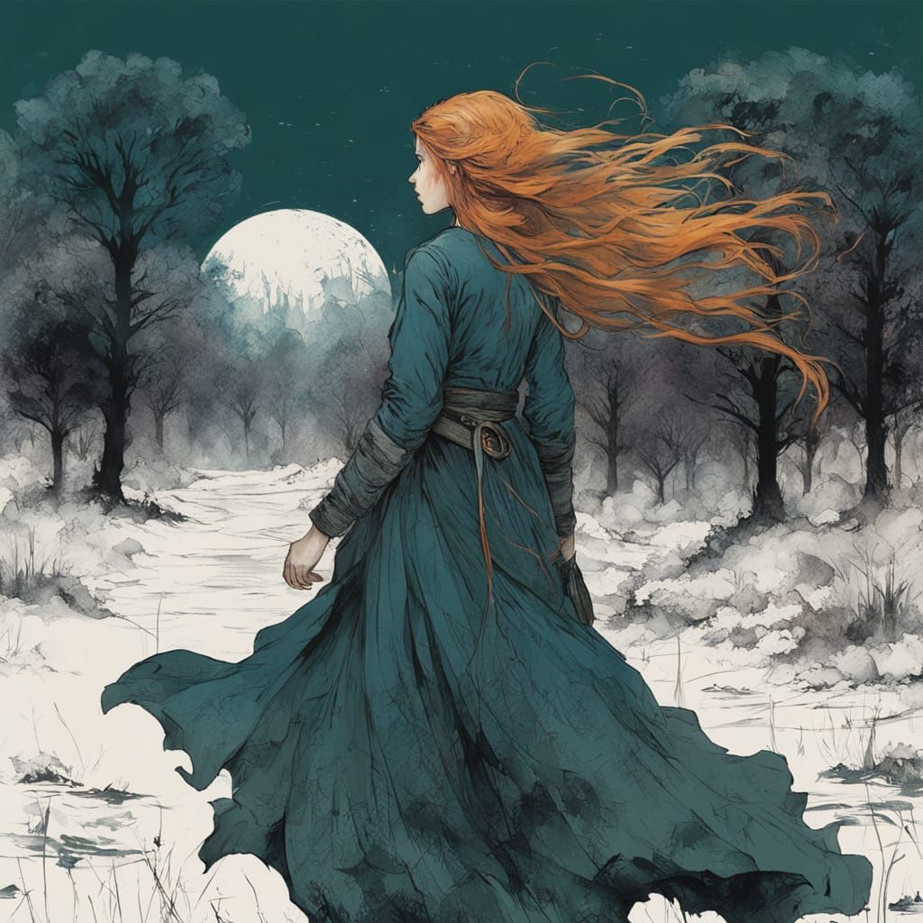 This image shows a teenage girl with deep ivory undertones in her hair, running from a mansion towards a dense forest. The scene features a dark teal and midnight blue color scheme with ethereal silhouettes and high depth of field.