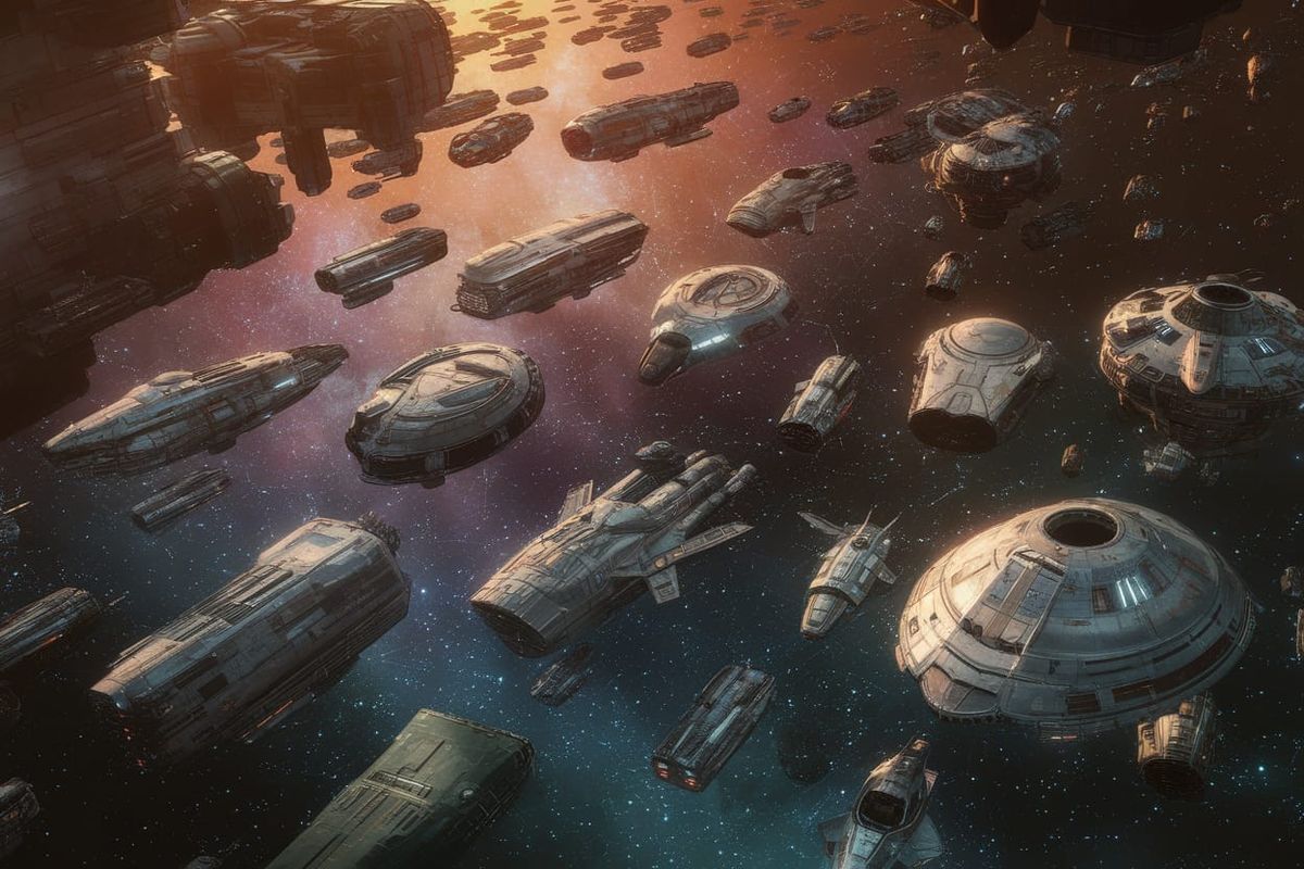This image depicts a junkyard floating in space, surrounded by stars, with various damaged spacecraft from science fiction and real-world origins, each illuminated in a warm, ethereal light, conveying a sense of melancholic beauty and abandoned history.