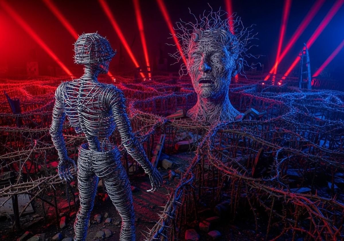 This image shows a wire soldier lost within a maze of thorns and rubble. The scene is illuminated by vivid crimson and cobalt light, creating a stark contrast to the macabre atmosphere.