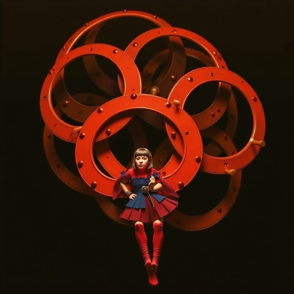 This image shows a unique fusion of Tutankhamun, a Harlequin, and a Geisha, rendered in photorealistic detail. The artwork prominently features shades of red with sharp focus and natural colors.