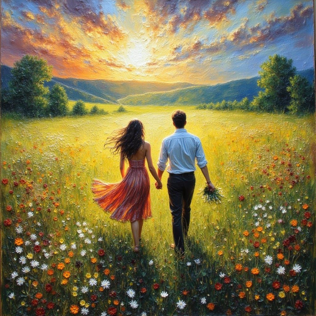 This image shows a couple walking through a field of wildflowers in the spring sunshine. The oil painting uses bright colors and dramatic lighting, reminiscent of encaustic techniques.