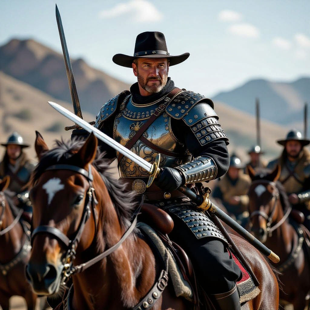 This image shows John Wayne leading a Mongol horde. The cinematic shot, reminiscent of a film still, features film grain, vignette, and dramatic, atmospheric lighting.