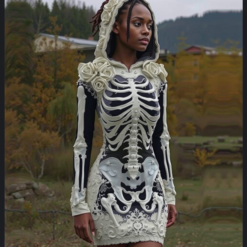 This photorealistic image shows a dark-skinned woman in a unique hooded dress with a skeleton design and fabric roses. Set against a soft autumn backdrop, the mood is surreal and detailed.