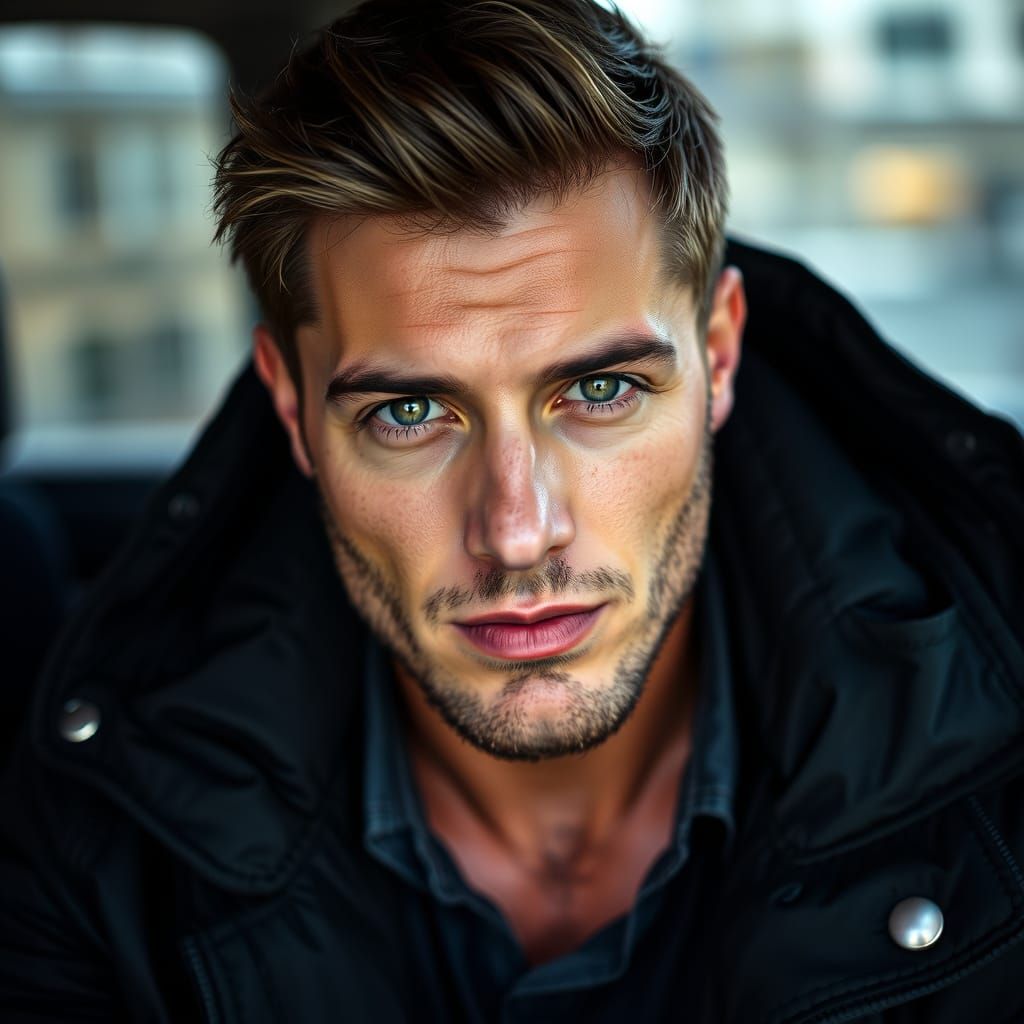 This captivating image depicts a striking man with a mesmerizing presence, featuring rich, dark hair and captivating emerald green eyes that seem to radiate an inner intensity