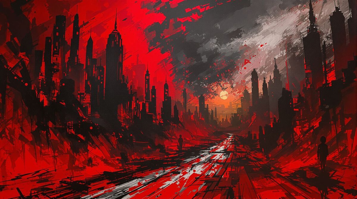 This image shows a surreal expressionist cityscape in shades of crimson and scarlet. Jagged strokes and impasto textures create a raw, emotional portrayal of urban passion and turmoil with dramatic lighting.