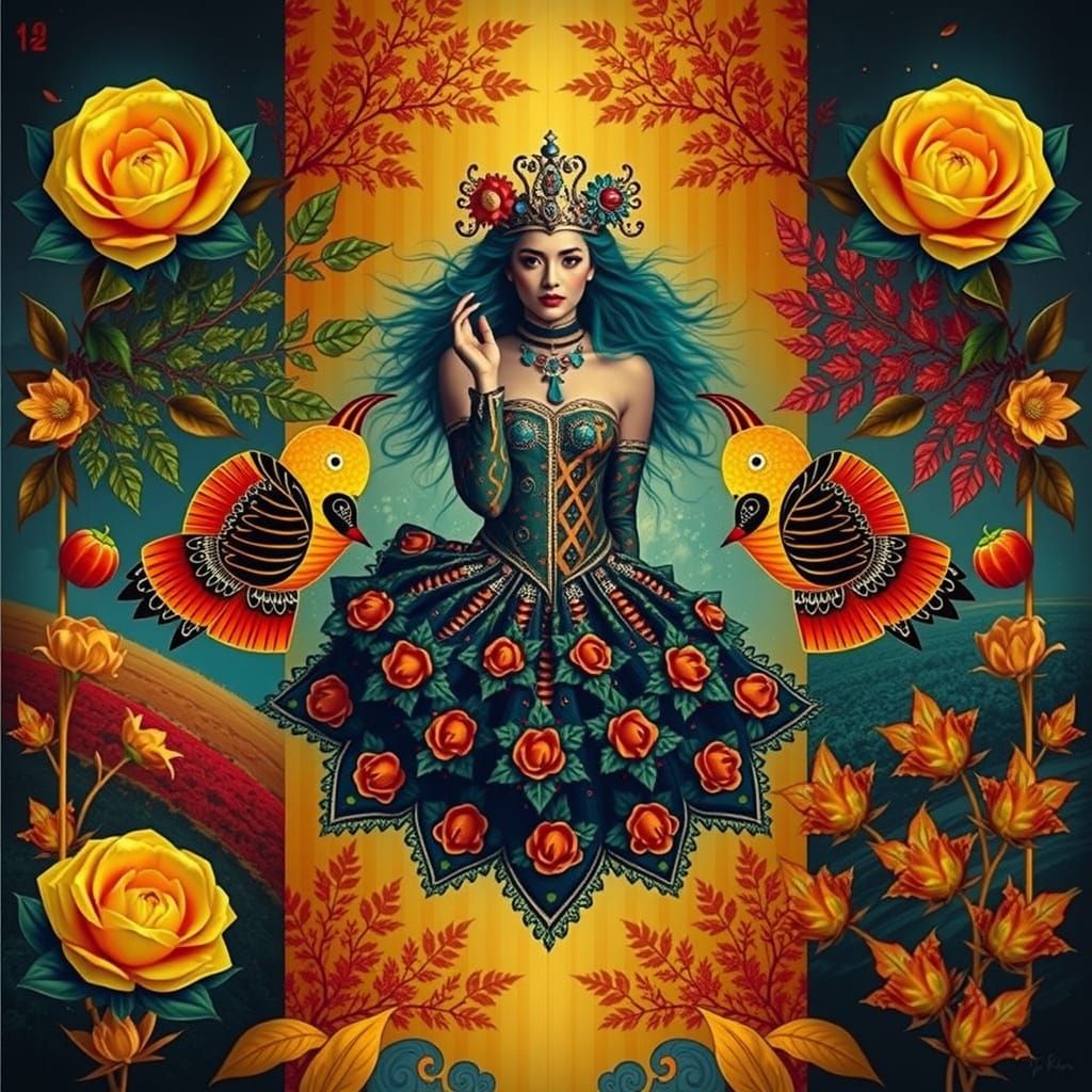 This photorealistic image depicts a profoundly foggy forest, blending surreal elements like teal hair and a chimaera with vibrant natural details. The style evokes a hyper-realistic, cloisonné-inspired aesthetic.