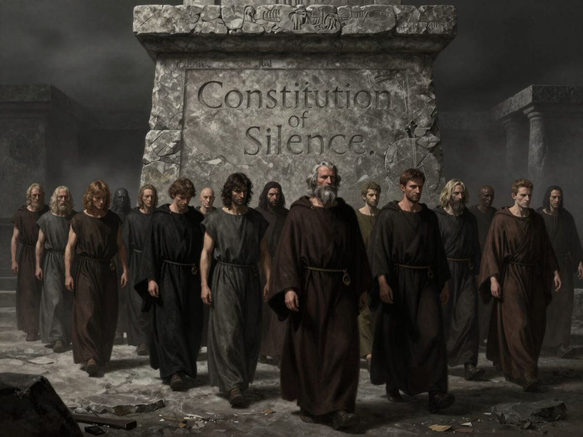 This image depicts a somber parade of robed figures moving towards an ancient monument inscribed with "Constitution of Silence." Rendered with dramatic, desaturated tones and chiaroscuro lighting, it evokes dark fantasy concept art.