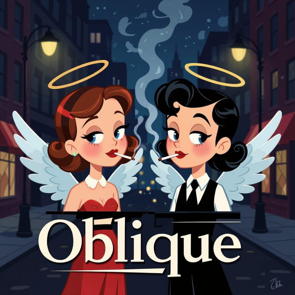 This image depicts two angelic figures in a 1930s New York City street scene, rendered in a vintage cartoon style. The figures, with playful features, face forward smoking under dynamic backlighting.