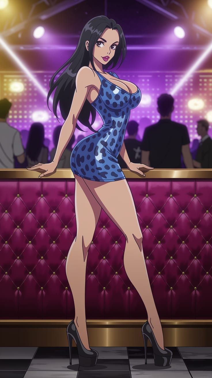 This digital art features a 23-year-old Mexican woman in an anime style, wearing a short animal-print dress and platform heels in a lively nightclub setting.
