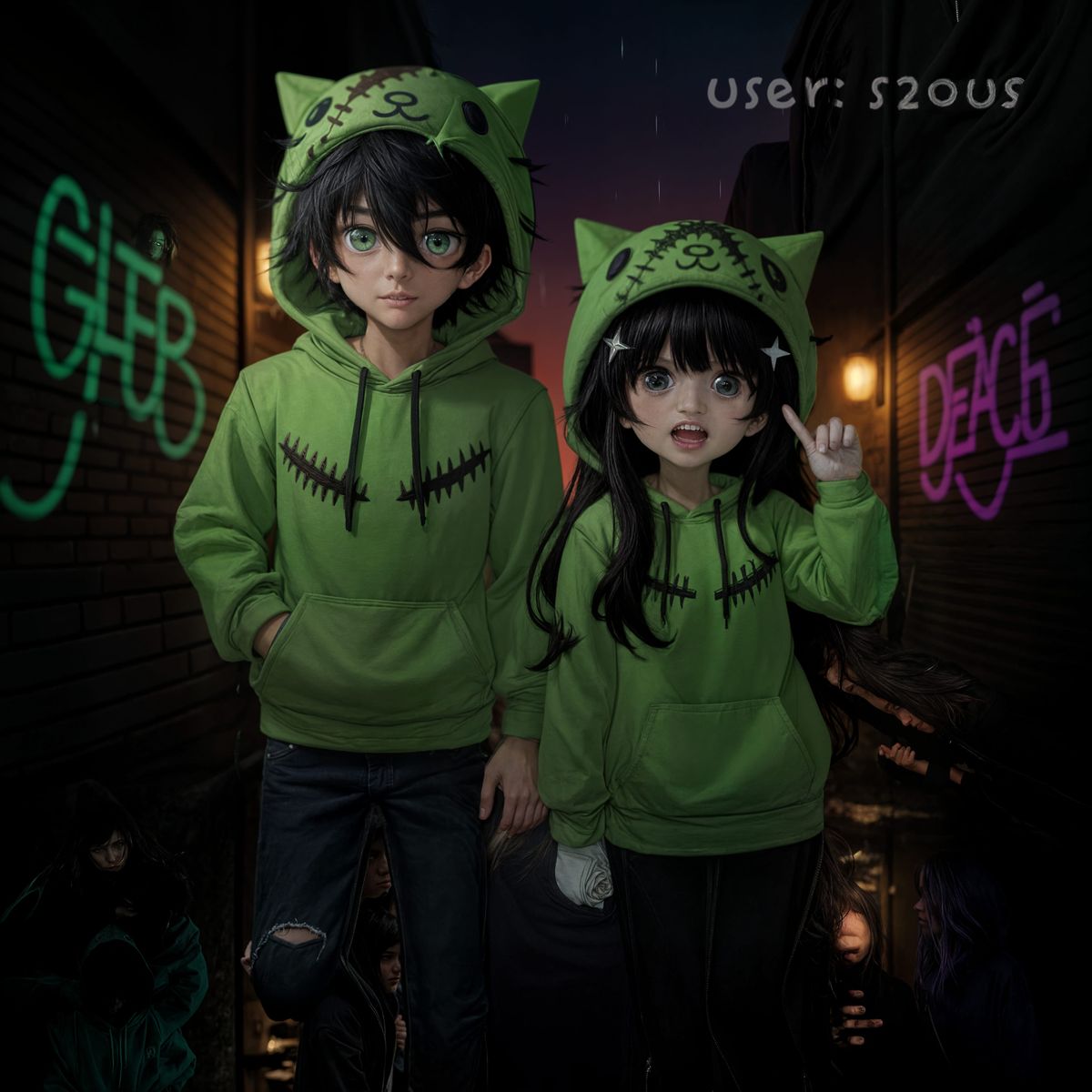 A vivid anime-style illustration of a trendy couple in matching cat-eared hoodies. Set in an atmospheric urban alleyway, the artwork captures their playful interaction in a stylized scene.