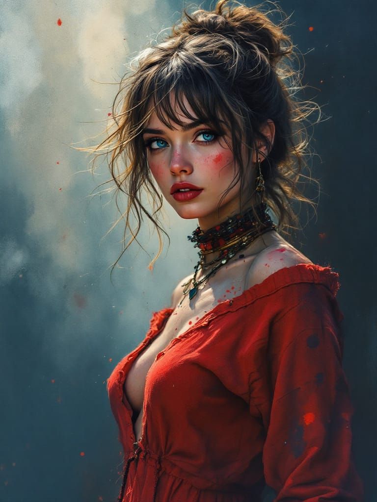 This image shows a woman with striking blue eyes and red paint on her cheeks, created with a blend of watercolor and surrealist techniques. Muted tones with silver and crimson accents create a moody atmosphere.