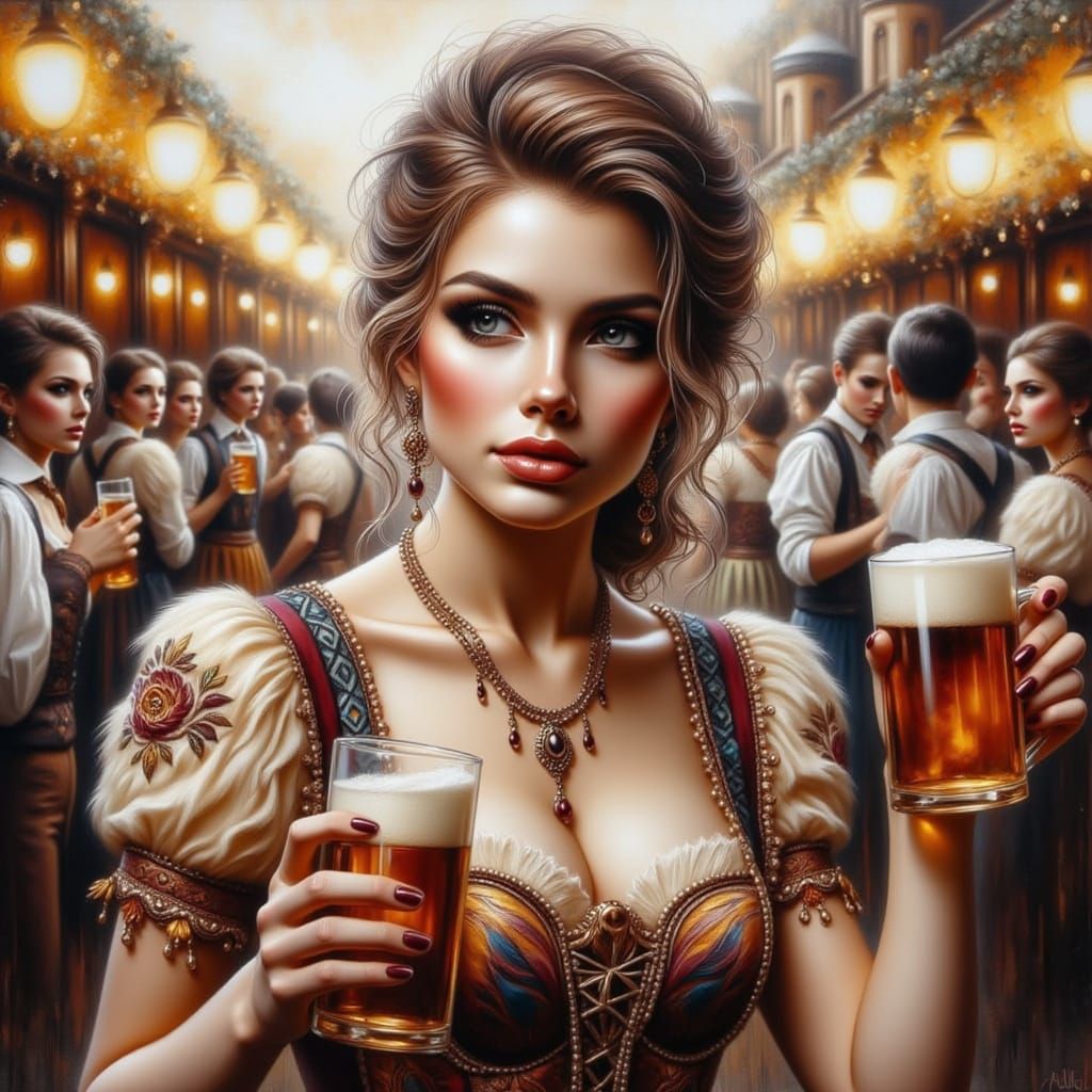 This vibrant painting depicts a German woman in a Dirndl, holding a stein of beer, amidst a lively Oktoberfest celebration, with intricate embroidery and bold brushstrokes, blending watercolor and acrylic textures, evoking a sense of spontaneity and joy.