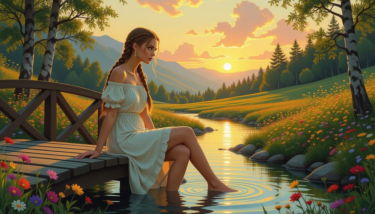 This image shows a Viking woman with braided hair, wearing a summer dress and sitting on a wooden bridge. She's dipping her feet in a river within a lush valley under warm sunset lighting, in a digital art style.