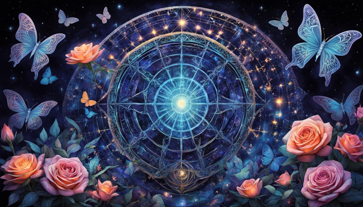 This vibrant digital artwork depicts a stunning chola-style skeleton goddess holding roses amidst a swirling vortex of butterflies, stars, and iridescent colors, evoking a sense of cosmic mysticism and sacred geometry.