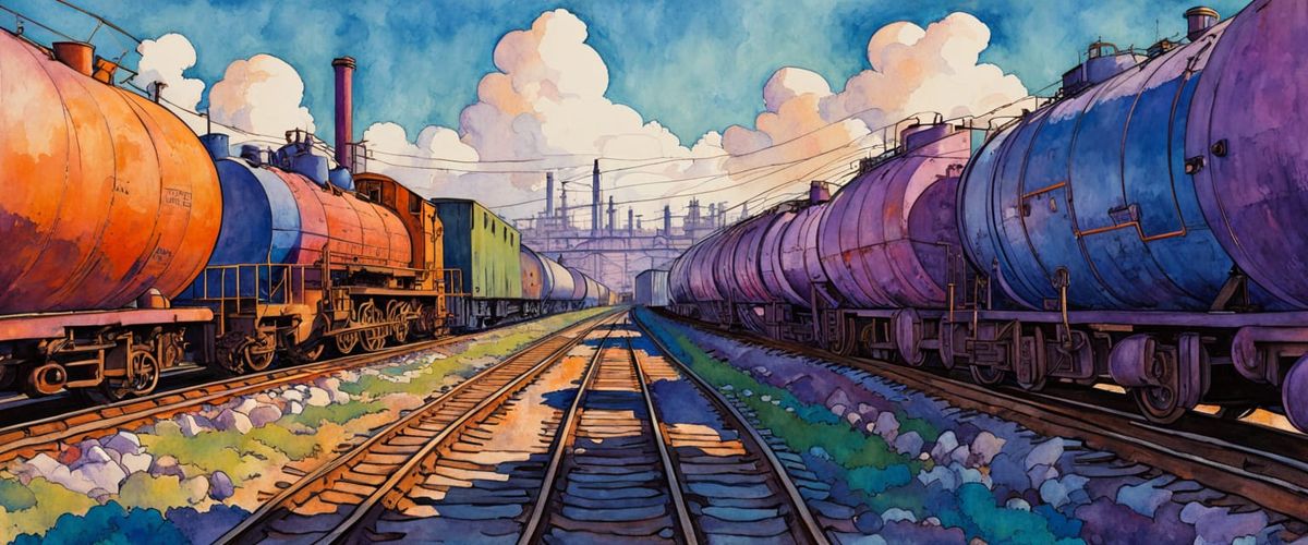 A vibrant watercolor painting of an industrial district featuring freight trains and graffiti under a blue sky. The image evokes impressionistic and Ghibli-esque styles with volumetric lighting.