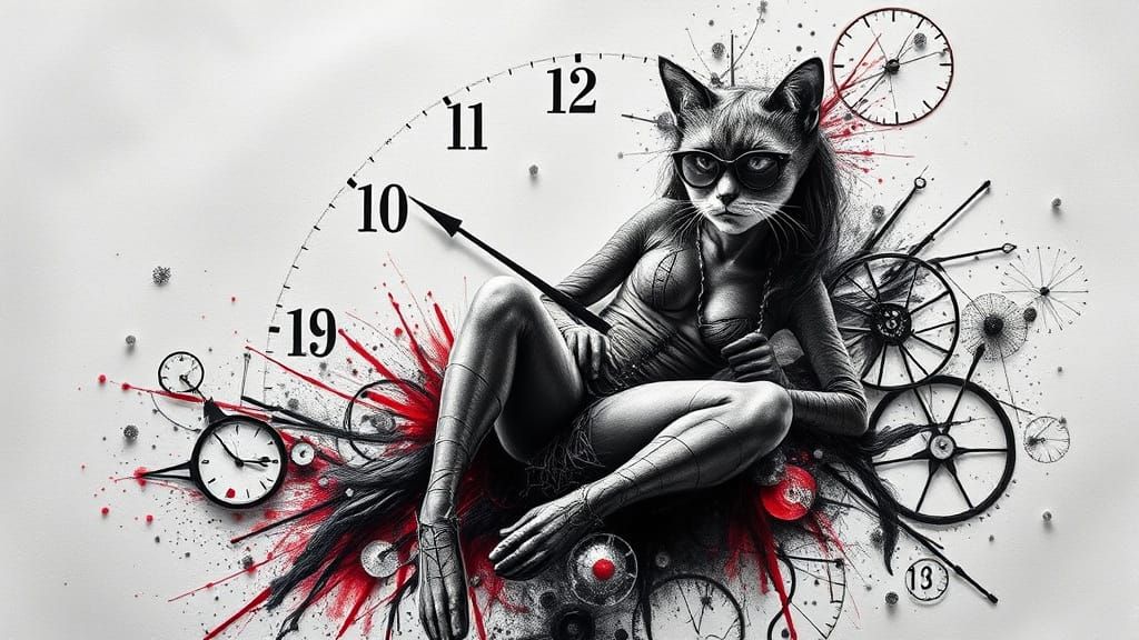A striking picture of a retro punk cat woman composed of colorful threads intertwined with a futuristic clock machine. She indicates a specific time with her legs in this monochrome, hyperdetailed image.