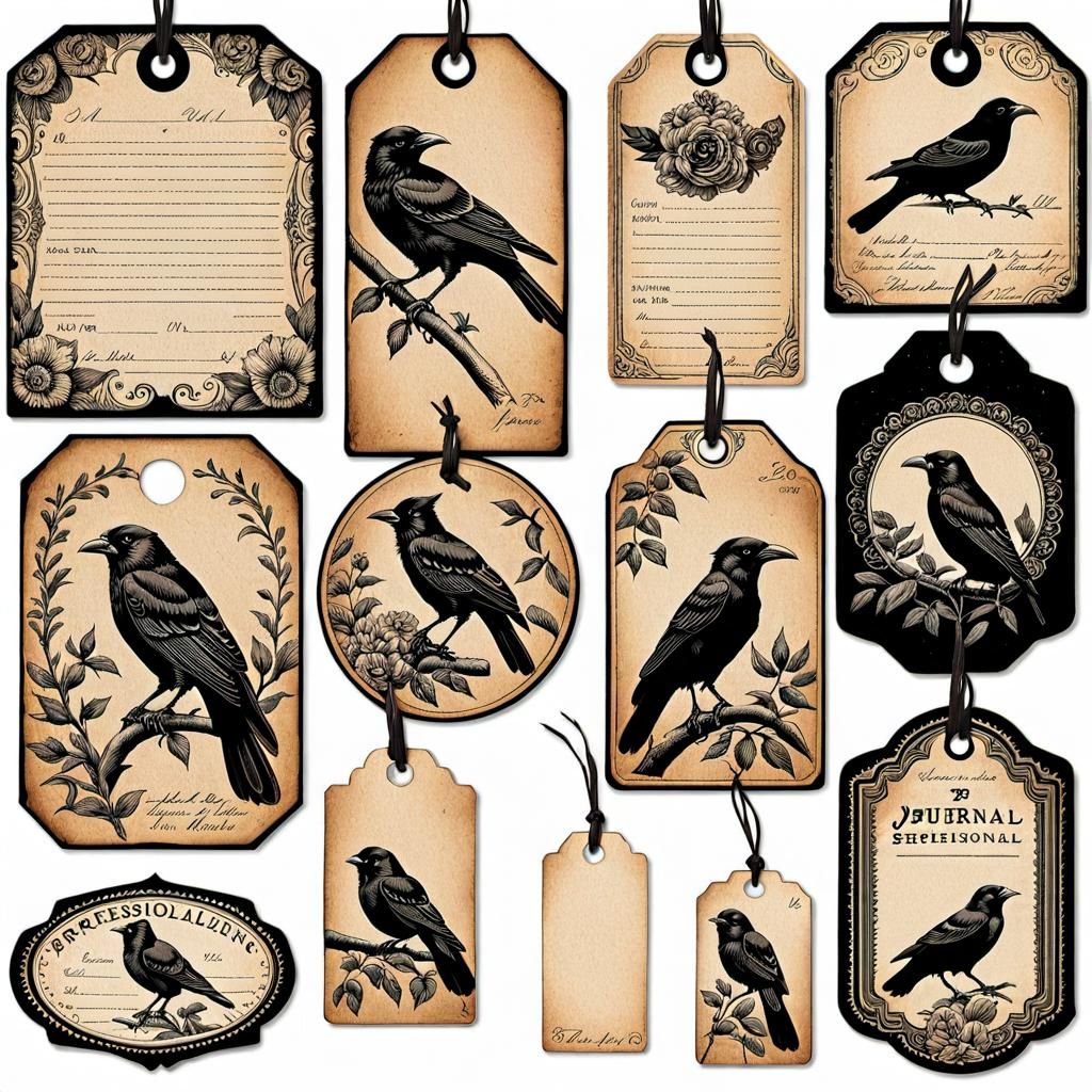 This image shows a collection of vintage shipping tags arranged for a junk journal. The tags feature detailed pen and ink drawings on aged paper, with a distressed sketch of a raven.