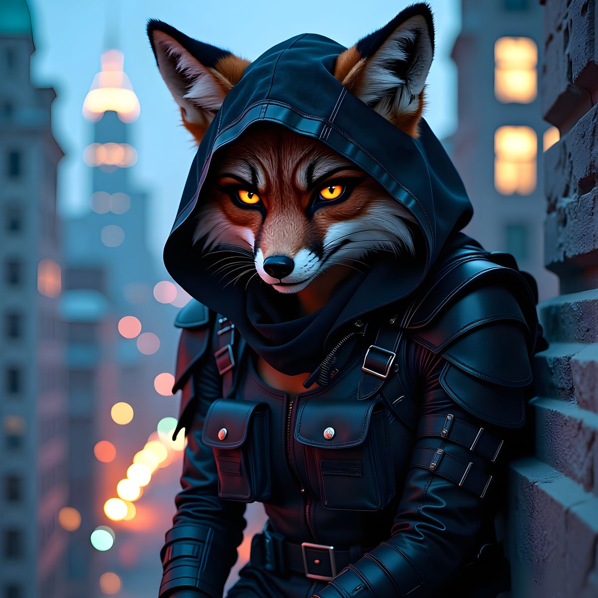 A striking picture of an anthropomorphic fox assassin perched high above a dark art-deco city at midnight. The image has a dark, high-contrast feel with vibrant colors and sharp details, in a fantasy style.