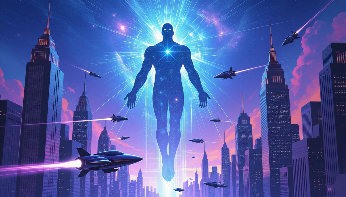 This digital illustration shows a massive cosmic entity made of starlight and nebulae landing in a chrome and neon city. Flying cars navigate art deco towers under its surreal glow, rendered in a painterly, dreamlike style.