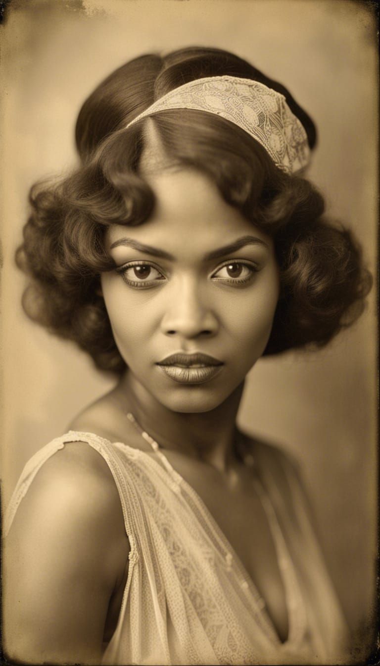 This image shows a vintage-style portrait of an African American woman reminiscent of the 1920s. The photo captures a delicate and lovely head and shoulders shot.