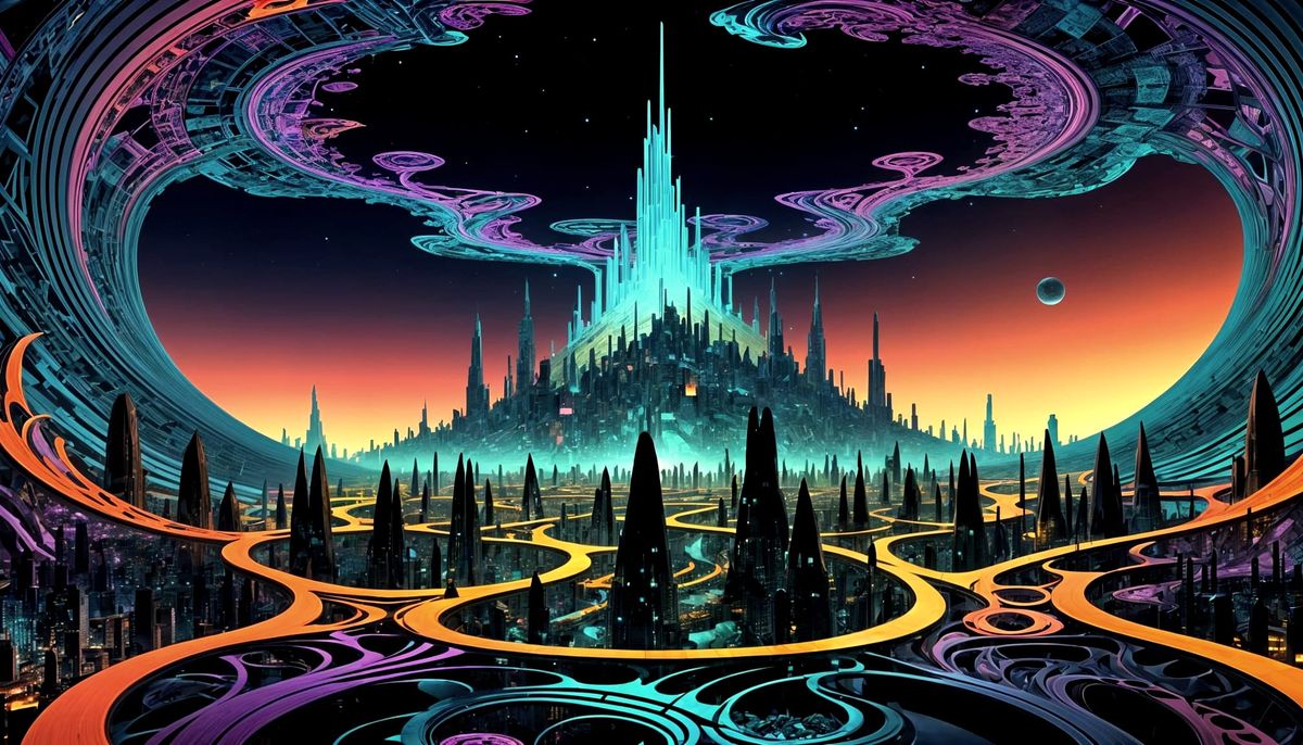 This image displays an Op-Art illusion of infinite grids folding inward, creating a kaleidoscopic recursion. The surreal city scene uses diverse, naturalistic colors.