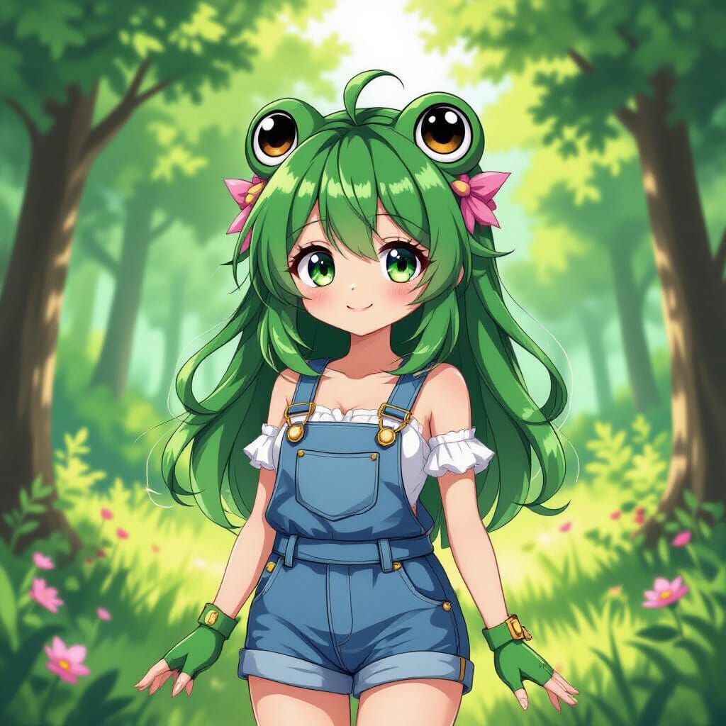 This image showcases a charming anime character with green skin and frog-like features, dressed in overalls, within a vibrant forest. Rendered in a clean, hand-drawn style with bright colors.