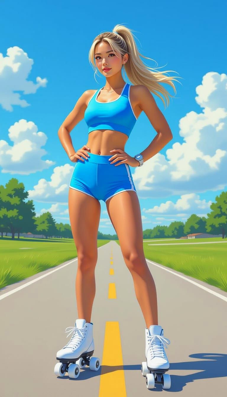 A photorealistic action shot of a woman on roller skates, wearing a bright blue athletic outfit. She stands confidently on a paved path with lush greenery under a clear, sunny sky.